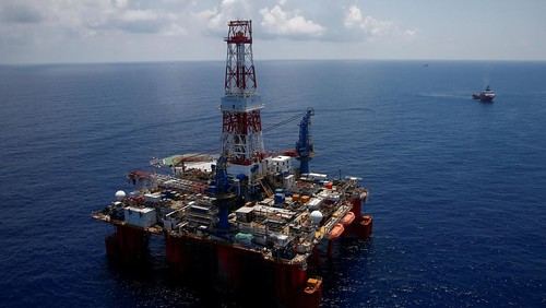 Giàn khoan JDC Hakuryu-5 và tàu hộ vệ ở ngoài khơi Vũng Tàu. Trong vòng ba tháng của năm 2019, các tàu Trung Quốc liên tục quấy phá hoạt động giàn khoan này tại bãi Tư Chính. Ảnh tư liệu chụp ngày 29/04/2019. Reuters/Maxim Shemetov/File Photo