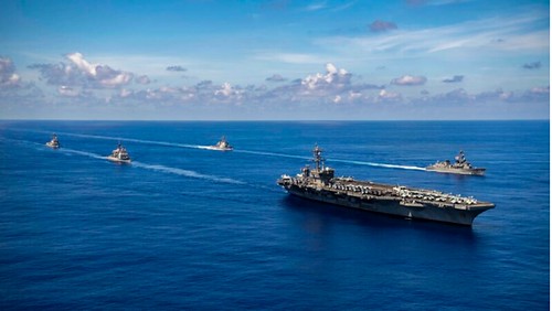 Hàng không mẫu hạm USS Carl Vinson (CVN 70) và các chiến hạm hộ tống của Mỹ bên cạnh hai khu trục hạm JS Ikazuchi và JS Chokai của Lực lượng Phòng vệ Nhật Bản tại Thái Bình Dương. Ảnh của Hải quân Hoa Kỳ ngày 19/09/2021. AP - MC2 Haydn Smith