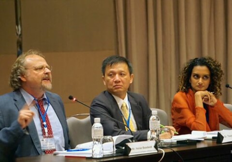 Tiến sĩ Heiner Beilefeldt, báo cáo viên đặc biệt Liên hiệp quốc về Tự do Tôn giáo- Tín ngưỡng (bên trái) và Tiến sĩ Nguyễn Đình Thắng, tổng giám đốc kiêm chủ tịch BPSOS (giữa) phát biểu tại Hội Nghị ngày 1 tháng 10, 2015 - Photo icj.org