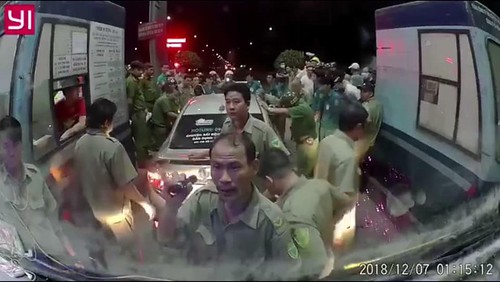 Một số cán bộ gồm, dân phòng, công an trật tự, cơ động... bảo kê trạm BOT An Sương - An Lạc đối với những người không mua vé khi qua. (Hình : Trích từ video)