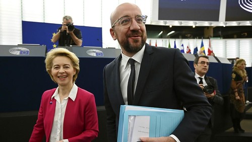 Chủ tịch Ủy Ban Châu Âu Ursula von der Leyen và chủ tịch Hội Đồng Châu Âu Charles Michel tại Nghị Viện Châu Âu, Strasbourg, Pháp, ngày 18/12/2019. FREDERICK FLORIN / AFP