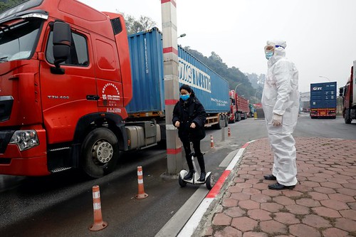 Các xe container chờ ở cửa khẩu Hữu Nghị, Lạng Sơn, trên biên giới với Trung Quốc hồi tháng 2/2020 khi dịch Covid-19 mới bùng phát tại Việt Nam. Hình : Reuters