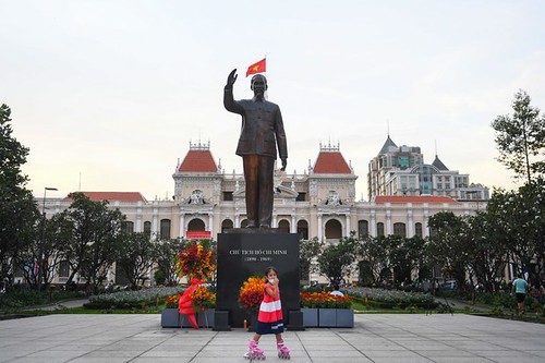 Một em gái trượt patin trước tượng Hồ Chí Minh ở Thành phố Hồ Chí Minh hôm 1/12/2021 - AFP