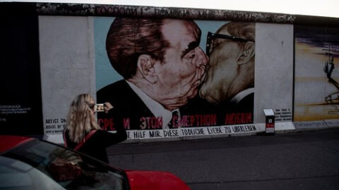 Bức tranh graffiti của Dmitry Vrubel trên Bức tường Berlin vẽ nhà lãnh đạo Liên Xô Leonid Brezhnev đang hôn Erich Honecker của Đông Đức