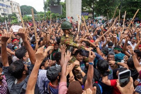 Sau khi bà Hasina rời Bangladesh ngày 5/8/2024, đám đông phấn khích công kênh một binh sĩ lên vai. Ảnh minh họa