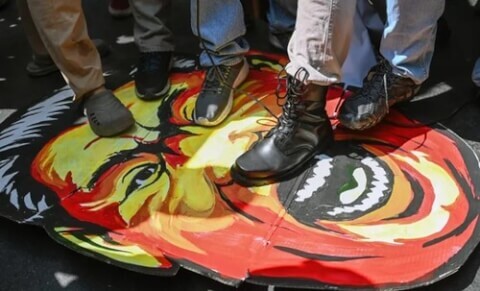 Người biểu tình giẫm lên bức tranh biếm họa có hình Chủ tịch Trung Quốc Tập Cận Bình trong cuộc biểu tình phản đối hành vi xâm phạm hàng hải của Trung Quốc trước lãnh sự quán Trung Quốc ở Makati, Manila vào ngày 9/4/2024. Jam Sta Rosa/AFP