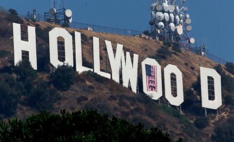 Hình minh họa : Cờ Mỹ treo trên biểu tượng Hollywood ở đồi Hollywood, California, Mỹ - Reuters