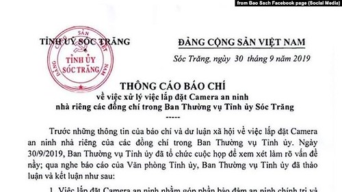 Thông cáo báo chí về việc xử lý lắp đặt camera tại nhà các cán bộ trong Ban Thường vụ Tỉnh ủy Sóc Trăng. Courtesy of Zing.vn/ RFA Edited