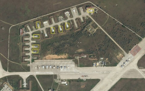 Căn cứ không quân Saki vài tiếng trước loạt vụ nổ bí hiểm. Máy bay vẫn còn nguyên vẹn với ánh bạc thấy rõ. Ảnh : Planet Labs.