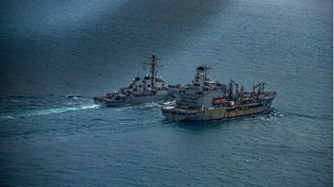 Tàu tiếp liệu lớp Henry J. Kaiser USNS Laramie (p) đang tiếp tế nhiên liệu cho khu trục hạm lớp Arleigh Burke USS Porter (DDG 78) trên Biển Đen ngày 06/02/2021. Patrol Squadron 46 - Petty Officer 2nd Class Austin I