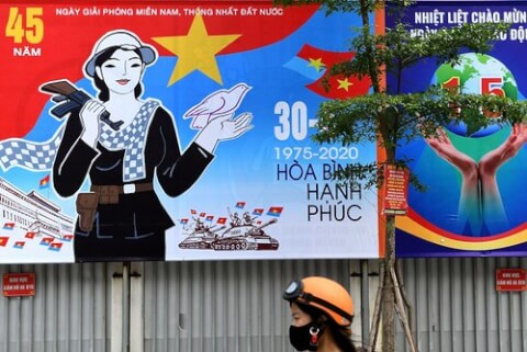 Áp phích nhân kỷ niệm 45 kết thúc cuộc chiến Việt Nam trên đường phố Hà Nội hôm 29/4/2020 AFP - Ảnh minh họa