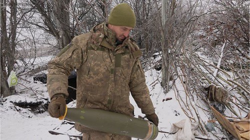 Quân nhân Ukraine ở chiến trường chống Nga bê đạn pháo 155 ly, nặng 45kg