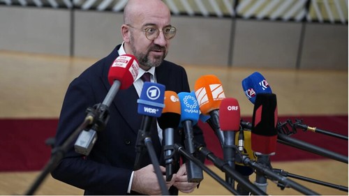 Chủ tịch Hội Đồng Châu Âu Charles Michel phát biểu với báo chí tại cuộc họp thượng đỉnh, Bruxelles, 26/10/2023. AP - Virginia Mayo