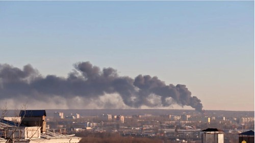 Khói bốc lên phía trên phi trường ở vùng Kursk của Nga ngày 06/12/2022. Thống đốc vùng cho rằng vụ hỏa hoạn xảy ra do bị drone Ukraine tấn công. AP
