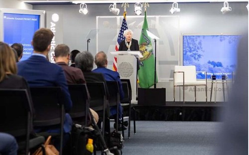 Bộ trưởng Tài chính Hoa Kỳ Janet Yellen phát biểu ở Atlantic Council, trình bày khái niệm “friend-shoring”, 13/4/2022. Ảnh: Atlantic Council.