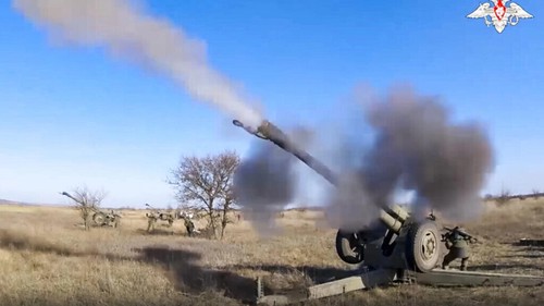 Ảnh trích từ video của bộ quốc phòng Nga công bố ngày 03/02/2023, cho thấy pháo binh Nga tấn công các vị trí, không nêu tên, của Ukraine. AP