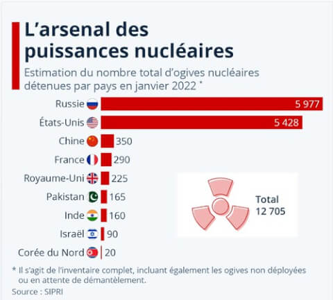 Ngược lại những đe dọa sử dụng vũ khí hạt nhân của lãnh tụ Nga, Vladimir Putin, mới đáng sợ vì Liên bang Nga hiện đang có trong tay gần 6.000 đầu đạn nguyên tử (chính xác là 5.977 năm 2022). Trong khi Mỹ có chưa có 5.500 đầu đạn (chính xác là 5.428 năm 2022).
