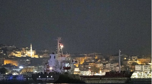 Tàu Resilient Africa mang cờ Palau đi dọc theo eo biển Bosphorus qua Istanbul (Thổ Nhĩ Kỳ) vào ngày 22/09/2023. Đây là chiếc tàu chở ngũ cốc đầu tiên đi từ Ukraine kể từ khi Nga tái áp dụng lệnh phong tỏa Biển Đen vào tháng 7/2023. AFP – Yasin Akgul