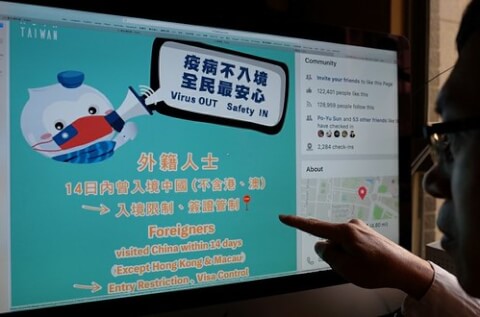 Hình chụp hôm 14/2/2020 - một người đàn ông đang chỉ vào trang web thuộc tài khoản Facebook của Bộ Ngoại giao Đài Loan dùng để đưa thông tin về Covid-19 ở Đài Bắc. AFP