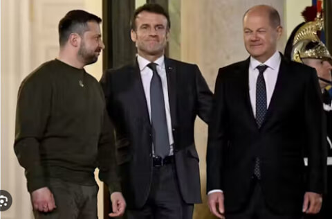 Tổng thống Pháp Emmanuel Macron, tổng thống Ukraine Volodymyr Zelensky và thủ tướng Đức Olaf Scholz tại điện Elysée, Paris, Pháp, ngày 08/02/2023. © AP / Sarah Meyssonnier