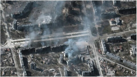 Ảnh vệ tinh chụp các toà nhà trong thành phố Mariupol, Ukraine, bị phá hủy, ngày 22/03/2022. via Reuters – Maxar Technologies