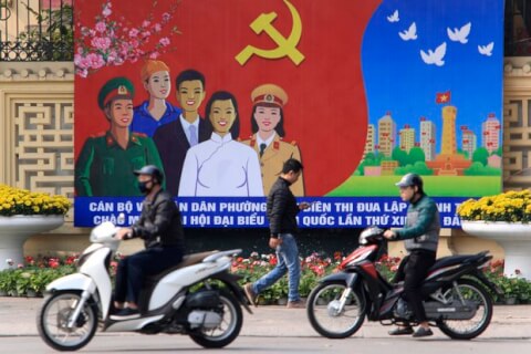 Một tấm panô tuyên truyền về Đại hội Đảng trên đường phố Hà Nội vào tháng 1/2021 - AP/Hau Dinh