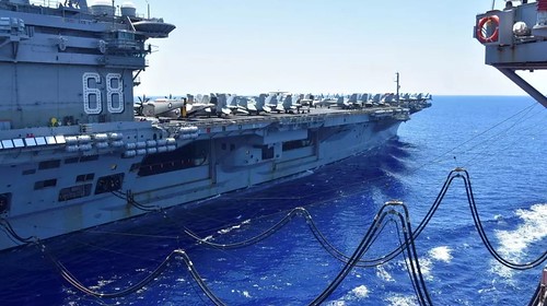 Hàng không mẫu hạm Mỹ USS Nimitz được tiếp liệu trên Biển Đông ngày 07/07/2020. © U.S. Navy/Christopher Bosch/Handout via Reuters