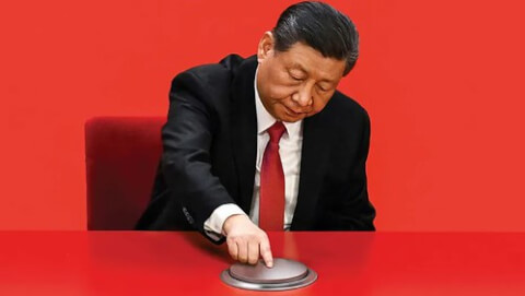 Chủ tịch Trung Quốc Tập Cận Bình, một mình trên nền đỏ đậm, chuẩn bị nhấn nút để khởi động một kế hoạch táo bạo nhằm tái thiết nền kinh tế Trung Quốc…