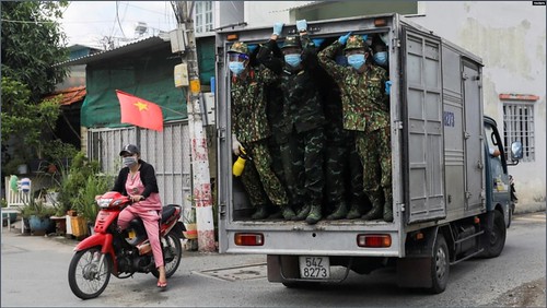 Chính quyền trung ương vào tháng trước đã điều quân đội Thành phố Hồ Chí Minh để hỗ trợ công tác kiểm soát dịch, thực hiện lệnh phong tỏa, cấm người dân rời khỏi nhà.