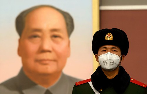Hình minh họa. Một cảnh sát đeo khẩu trang phòng dịch đứng trước bức hình lãnh tụ Mao Trạch Đông ở quảng trường Thiên An Môn, Bắc Kinh hôm 28/1/2020 AFP