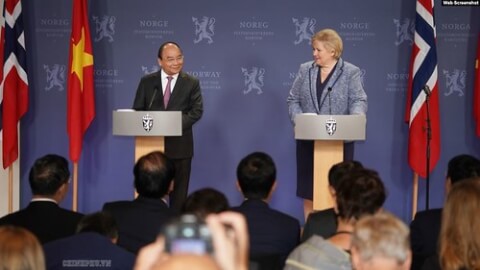 Thủ tướng Nguyễn Xuân Phúc và Thủ tướng Na Uy Erna Solberg tại cuộc họp báo. Photo Báo Quốc tế/VGP News.
