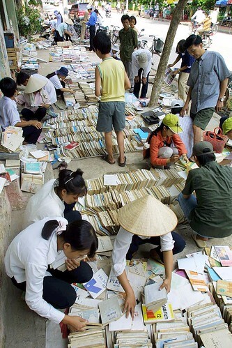 Học sinh và phụ huynh tìm sách giáo khoa cũ được bày bán trên vỉa hè ở Bắc Ninh hôm 30/8/2002 (minh họa). AFP