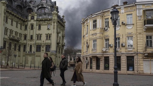 Khói bốc lên từ một khu phố ở Odesa, Ukraine, bị Nga oanh kích, ngày 03/04/2022. © AP - Petros Giannakouris