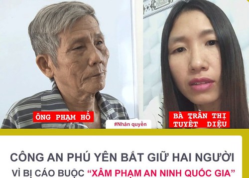 Cơ quan An ninh điều tra công an tỉnh Phú Yên hôm 22/8/2020 cho hay, cơ quan này đã bắt tạm giam 2 người ở tỉnh này là ông Phạm Hổ và bà Trần Thị Tuyết Diệu vì các cáo buộc liên quan đến an ninh quốc gia.