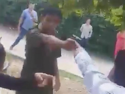 Công an nổ sung trong lúc đánh nhau với nhóm thanh niên. Ảnh cắt từ clip. Tuổi Trẻ