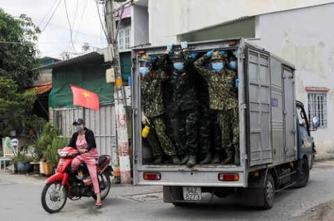 Bộ đội Việt Nam giao thực phẩm trong những khu vực phong tỏa ở Thành phố Hồ Chí Minh hôm 24/8/2021. Reuters