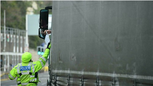 Cảnh sát kiểm tra chứng nhận y tế của một tài xế xe tải chở hàng từ Pháp vào Anh, qua cảng Dover, ngày 01/01/2021 - Justin Tallis/AFP