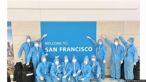 Phi hành đoàn của Vietnam Airlines tới San Francisco để đư a công dân Vi ệt Nam về nước trong chuyến bay thứ 3 hồi người người Việt từ Mỹ. (Ảnh chụp màn hình Người