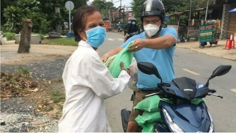 Thiện nguyện viên chương trình " Hạt gạo yêu thương" phân phát gạo cho dân nghèo ở Sài Gòn. © Linh mục Trương Văn Phúc, Dòng Tên