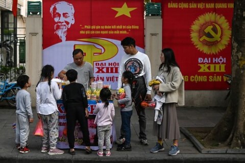 Một gia đình người dân đứng mua kem trước một tấm biển cổ động cho Đại hội 13 Đảng cộng sản Việt Nam ở Hà Nội hôm 24/1/2021 – AFP - Ảnh minh họa