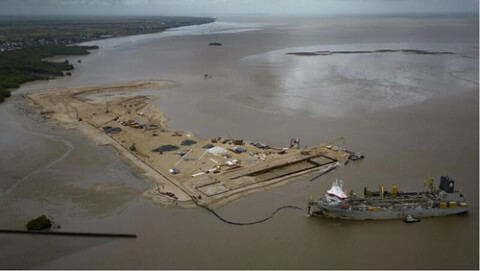 Một con tàu bồi cát xây đảo nhân tạo lập cảng để sản xuất dầu ở cửa sông Demerara ở Georgetown, Guyana. Ảnh chụp ngày 12/04/2023. AP - Matias Delacroix