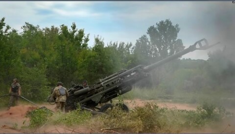 Các binh sĩ Ukraine bắn vào các vị trí của Nga từ một khẩu lựu pháo M777 do Mỹ cung cấp ở khu vực Donetsk, miền đông Ukraine, ngày 18 tháng 6 năm 2022.