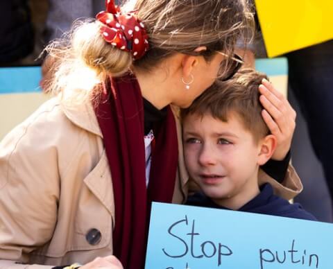 Một phụ nữ đang dỗ dành một bé trai trong cuộc biểu tình phản đối chiến tranh ở Ukraine - Reuters