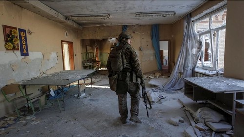Một người lính Ukraine trong một trường học bị phá hủy ở khu vực gần tiền tuyến, vùng Donetsk. Ảnh chụp ngày Giáng sinh của Chính Thống giáo, ngày 7/1/2023. Reuters - Stringer