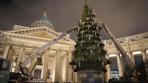 Công nhân trang trí cây thông Noel gần Nhà thờ Kazansky, tại Saint Petersburg, Nga, ngày 13/12/2022. AP - Dmitri Lovetsky