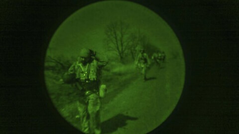 Quân nhân Ukraine được chụp lại qua kính nhìn ban đêm (NVG), trên tiền tuyến gần Avdiivka, vùng Donetsk, Ukraine, ngày 20/03/2024. AP - Alex Babenko
