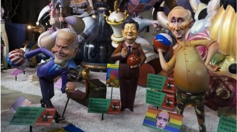 Tượng nhỏ bằng giấy được trưng bày tại lễ hội Fallas ở Valencia. Từ trái sang phải : Tổng thống Mỹ Joe Biden, chủ tịch Trung Quốc Tập Cận Bình và tổng thống Nga Vladimir Putin. AFP-Jose Jordan