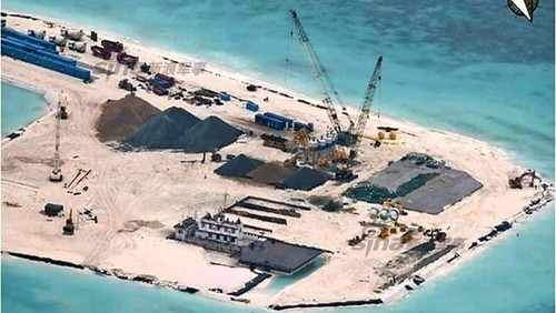 Trong trường hợp của Hoàng Sa và Trường Sa, tôi nhớ là vào năm 2014, chúng tôi có xem những bức ảnh chụp làm cho mọi người phì cười bởi vì quý vị sẽ thấy những hòn đảo ở đây đang phình to ra, đúng hơn là những đảo nhỏ, những mỏm đá đang phình to. Bởi vì Trung Quốc hy vọng có thể biến các mỏm đá thành đảo, những bãi đá không nhô lên khỏi mặt nước lúc thủy triều lên và những bãi đá này không hề có quy chế đảo.