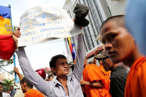 Người Campuchia biểu tình phản đối Việt Nam trước đại sứ quán Việt Nam tại Campuchia năm 2014, yêu cầu Việt Nam trả lại vùng đất lịch sử Kampuchea Krom