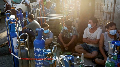 Người dân địa phương xếp hàng chờ nạp ôxy vào bình vào lúc Covid-19 bùng phát mạnh tại Rangoon, Miến Điện, ngày 14/07/2021. Reuters - Stringer